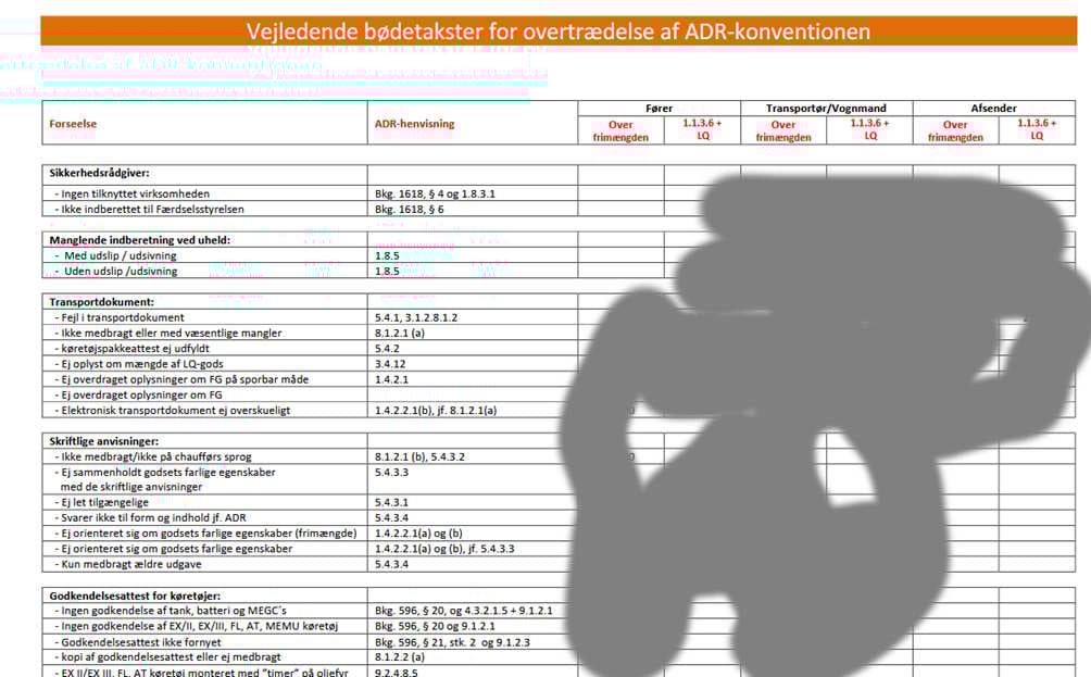 Fra Politiet vejl. bødekatalog – det fylder 7 sider kun med forskellige bøder for ADR overtrædelser – selve taksterne er overstreget, fordi det kun er tænkt som internt værktøj