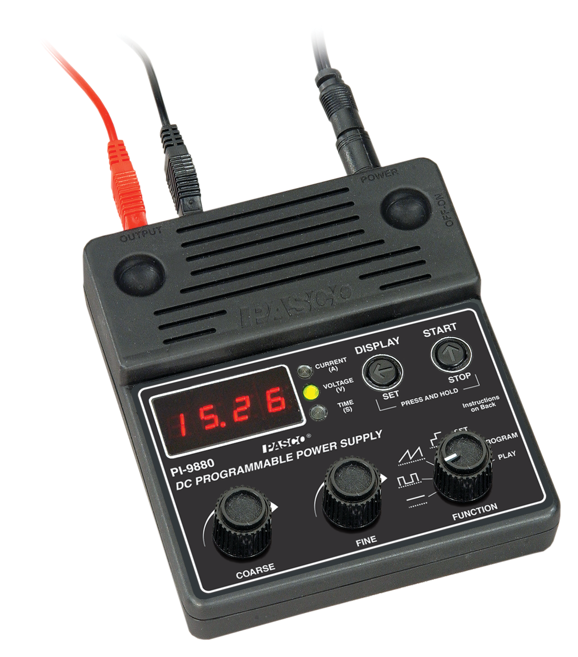 Der er både grov- og finjusteringsknapper. Som en sikkerhedsfaktor kan der indstilles en maksimal strøm og en maksimal spænding for at beskytte dine elevers eksterne kredsløb. Udgangen er spændingsreguleret, men ikke strømreguleret.