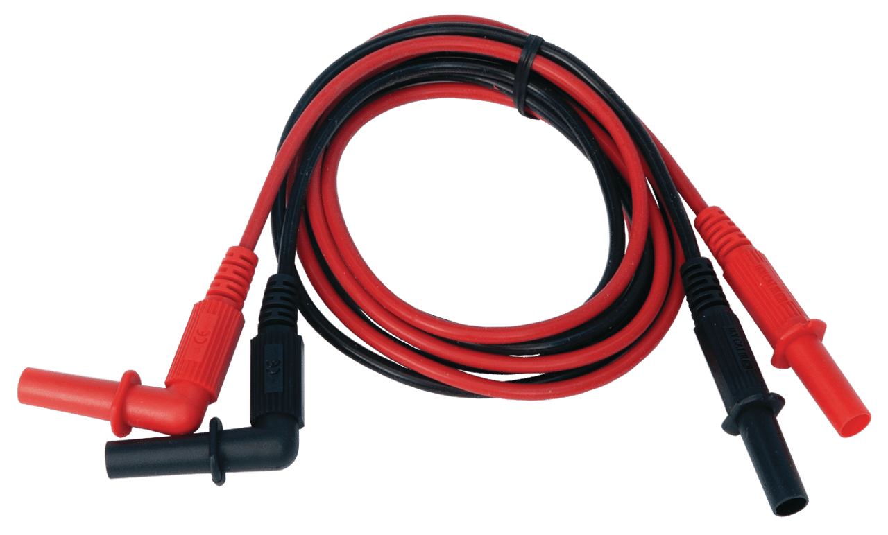 Indkapslet (4 mm) hanbananstik til retvinklet indkapslet hanbananstik 120 cm langt (et rødt og et sort).
