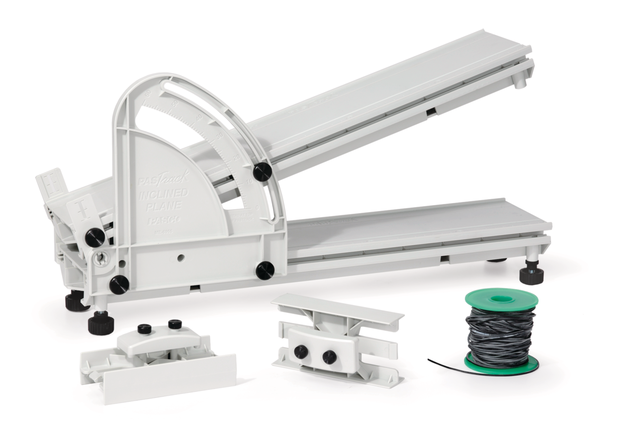 Tilbehøret til skråplanet omfatter hængslet med vinkelskala og gummisnoren til gummikofangeren. Der kræves et PAStrack for at lave et komplet skråplan.