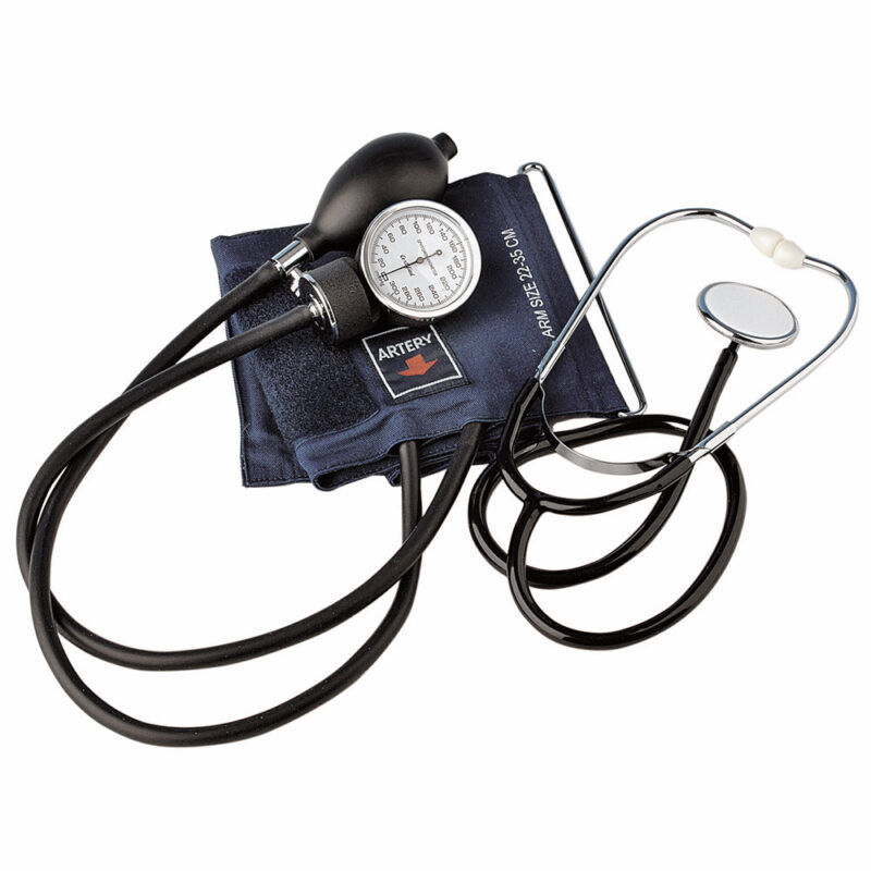 Klassisk blodtryksmåler til undervisningsbrug. Leveres med alt inkluderet: analogt manometer, blodtryksmanchet, pumpe med ventil og stetoskop.