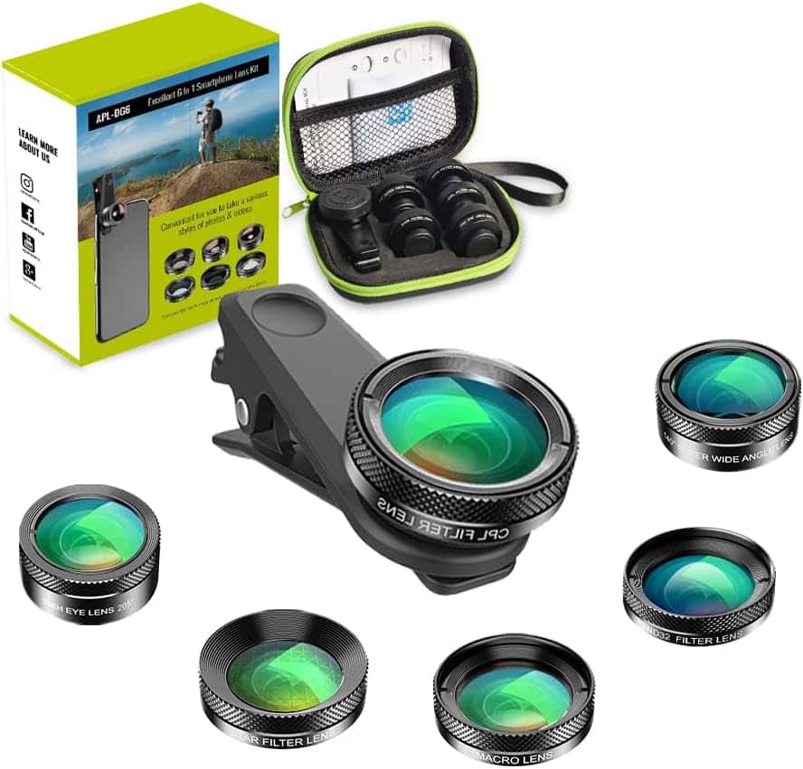 Med APEXEL 6-in-1 kameralinse-kit får du et alsidigt og præcist sæt, der løfter din smartphone-kameraoplevelse til et nyt niveau. Sættet omfatter bl.a. en 140° vidvinkel, 205° fisheye og 25× makrolinse samt CPL- og ND32-filtre, alle fremstillet i aluminium og med kvalitetoptik.