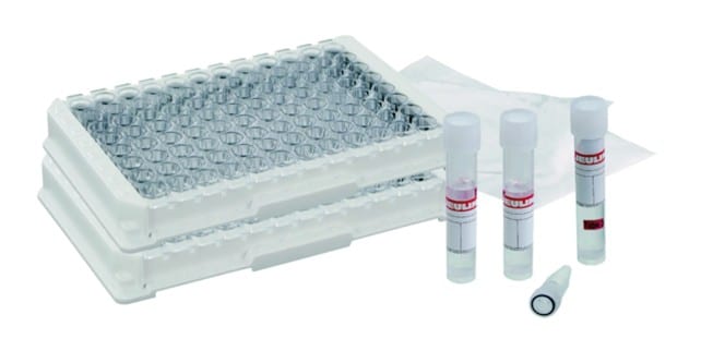 To ELISA-kit 24 par-plader og fire væskefyldte hætteglas er anbragt på en hvid flade.