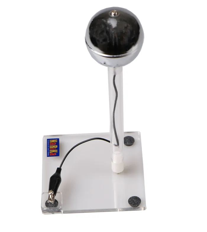 Udløbskugle fra Narika, monteret på stang og fastgjort til bundpladen. På pladen sidder en tilslutningsstift, som er forbundet til metalkuglen via kabel, og som kan tilsluttes højspænding. Passer perfekt sammen med en generator fra Narika, men kan bruges sammen med andre højspændingsgeneratorer. Hvis to udledningskugler hver især er forbundet til terminalerne på fx Narikas generator og placeret tæt på hinanden, får man en udladning, der kan ses som gnister mellem de to kugler. I tørt vejr kan der opnås gnister på helt op til 8 mm ved hjælp af den håndbetjente generator.