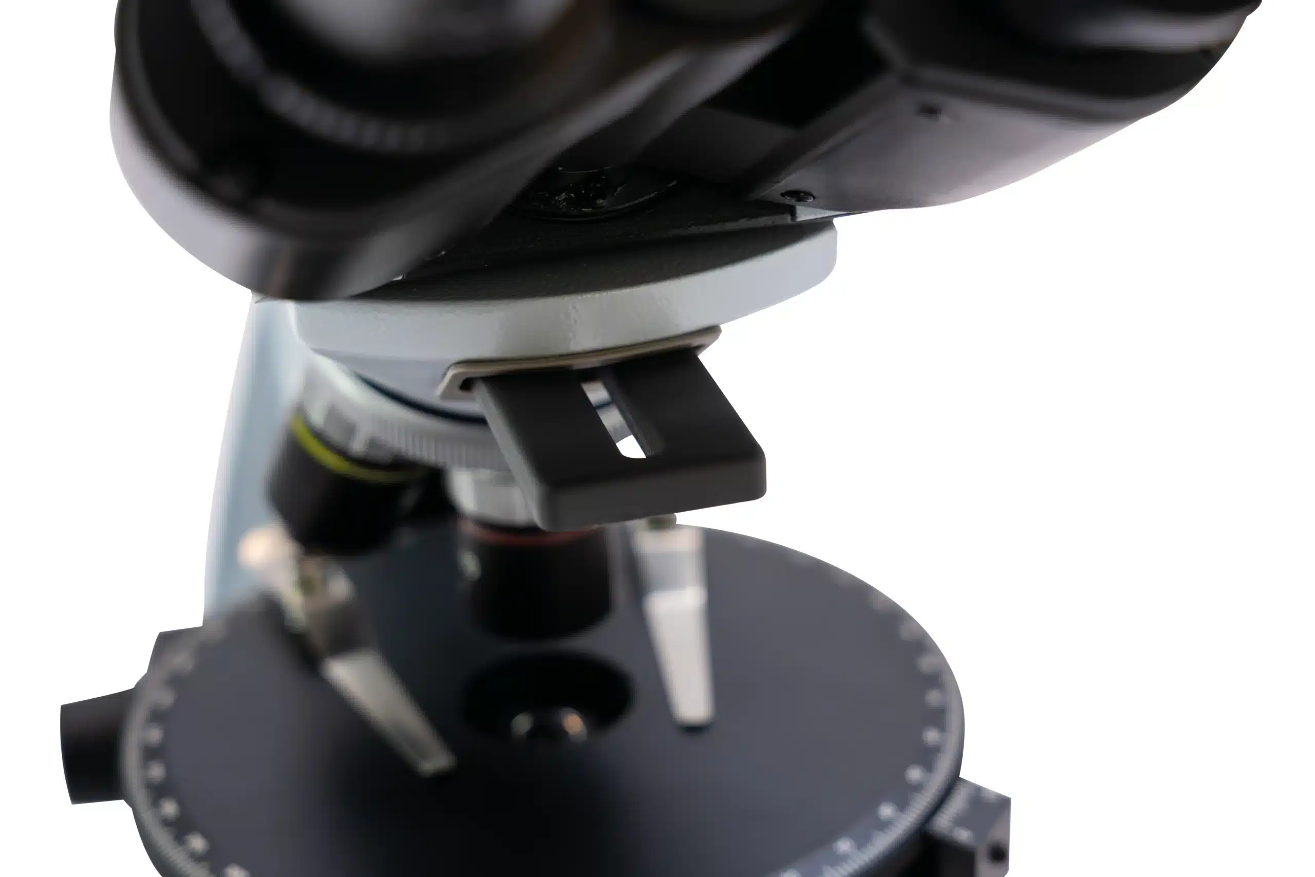 Som i version 1.0 af DELio-polarisationsmikroskopet er analysatoren stadig placeret i hovedet og polarisatoren på belysningsblokken. Nu er det dog polarisatoren, der er justerbar, og ikke analysatoren. Analysatoren er ikke længere justerbar; den fungerer via et glidende system og kan enten placeres i den optiske bane eller fjernes fra den. Polarisatoren er stadig placeret på belysningsblokken og kan orienteres fra 0 til 360°.