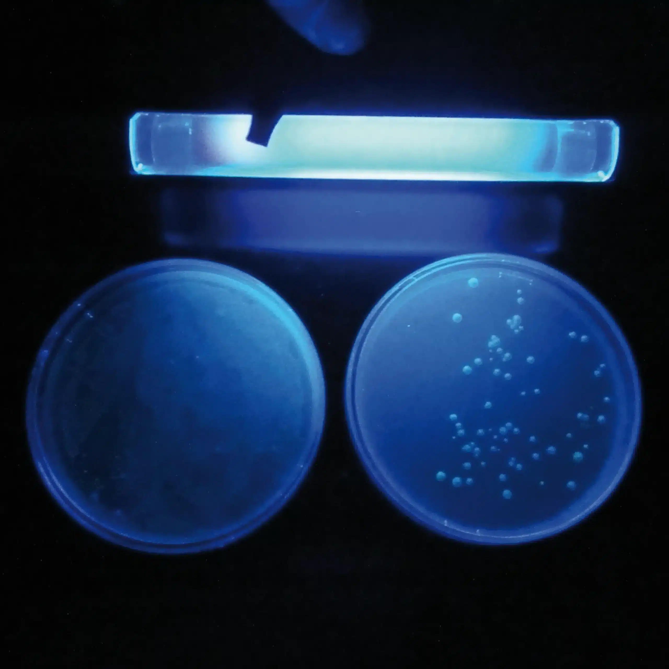 En ultrasimpel transformationsprotokol tilpasset skolemiljøet! Jeulin har designet en protokol, der ikke kræver, at cellerne er kompetente. Alt du skal gøre er at resuspendere friske gærceller fra en koloni, blande plasmid-DNA’et med transformationsopløsningen, omrøre (hvirvel) og derefter lade det inkubere i 30 minutter ved 42°C. Gæren dyrkes derefter for at verificere effektiviteten af overførslen, og ekspressionen af bioluminescensgenet afsløres ved at belyse skålene med UV-stråling.