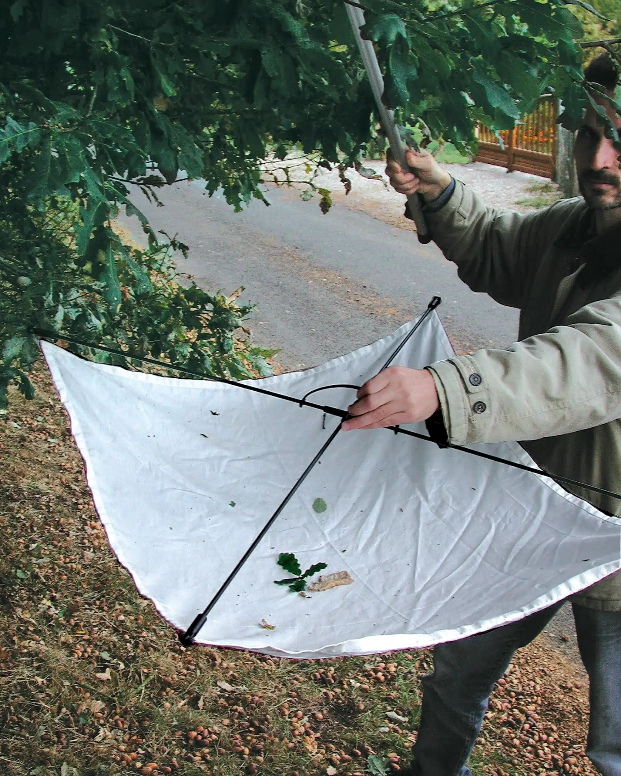 Takket være sin ramme kan den japanske paraply let forlænges under grenene, selv af en enkelt bruger. Fuldt foldbar for minimal bulk. Det giver dig mulighed for at nå de laveste og mindst let tilgængelige grene.