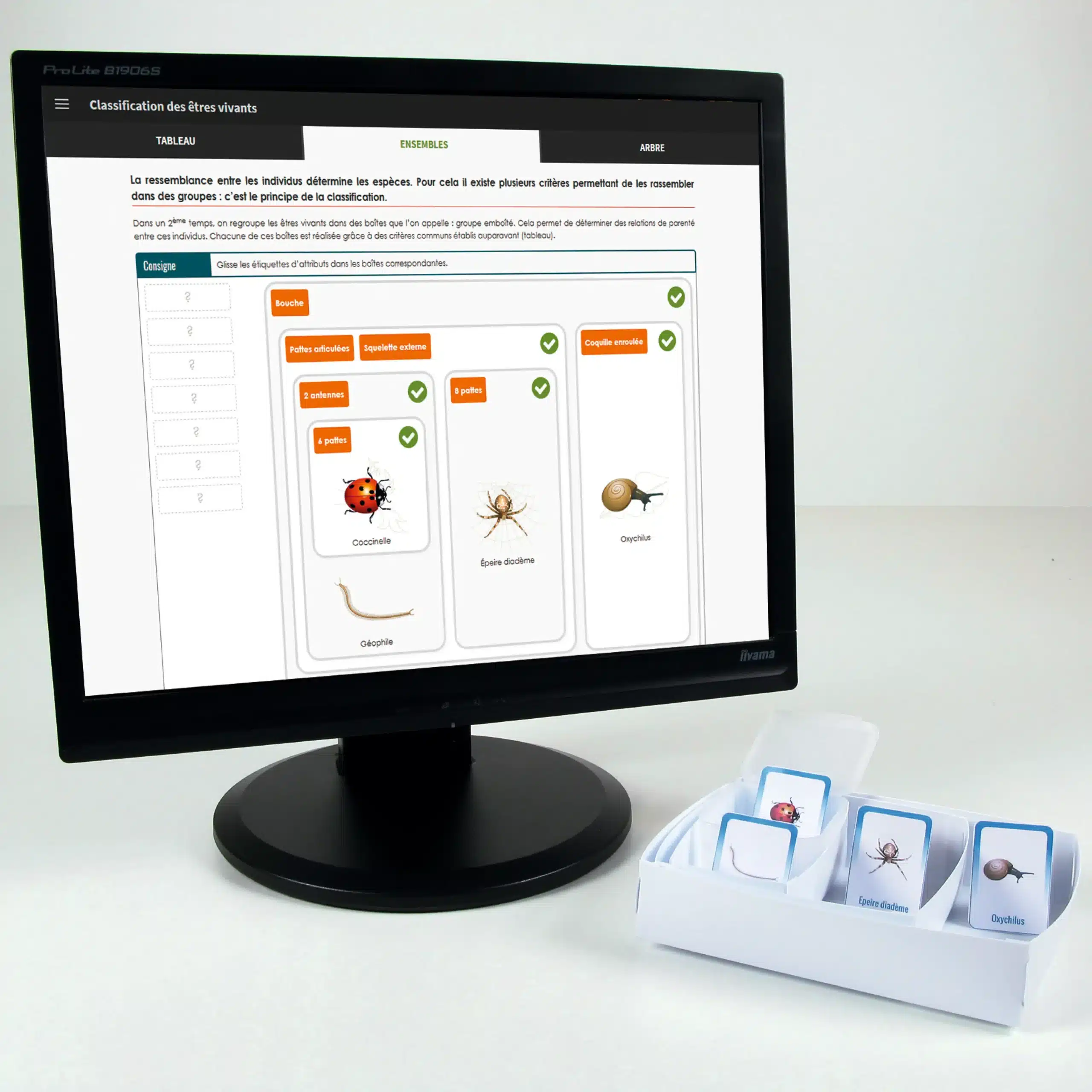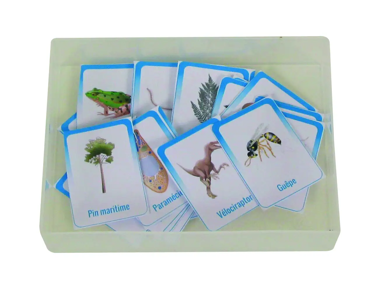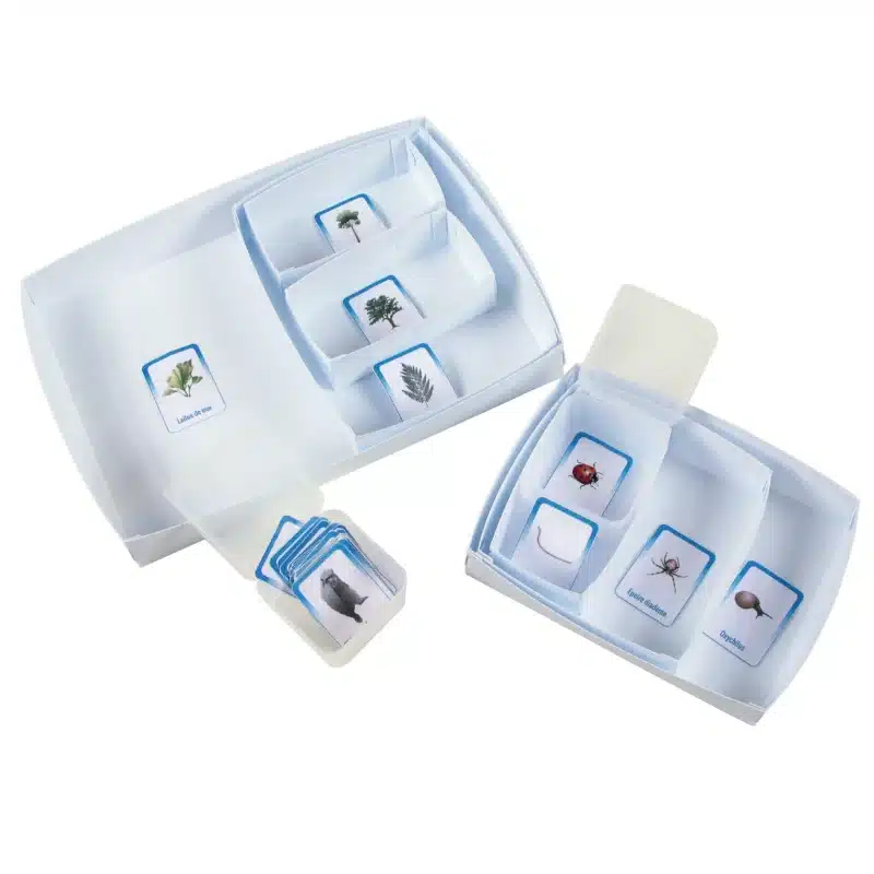 Prøver kan være ægte eller repræsenteret af fotos eller billeder. Produktet indeholder 32 kort af dyr valgt for deres særegenheder. Kassernes størrelser giver mulighed for en klassificering af op til 5 niveauer af kriterier.