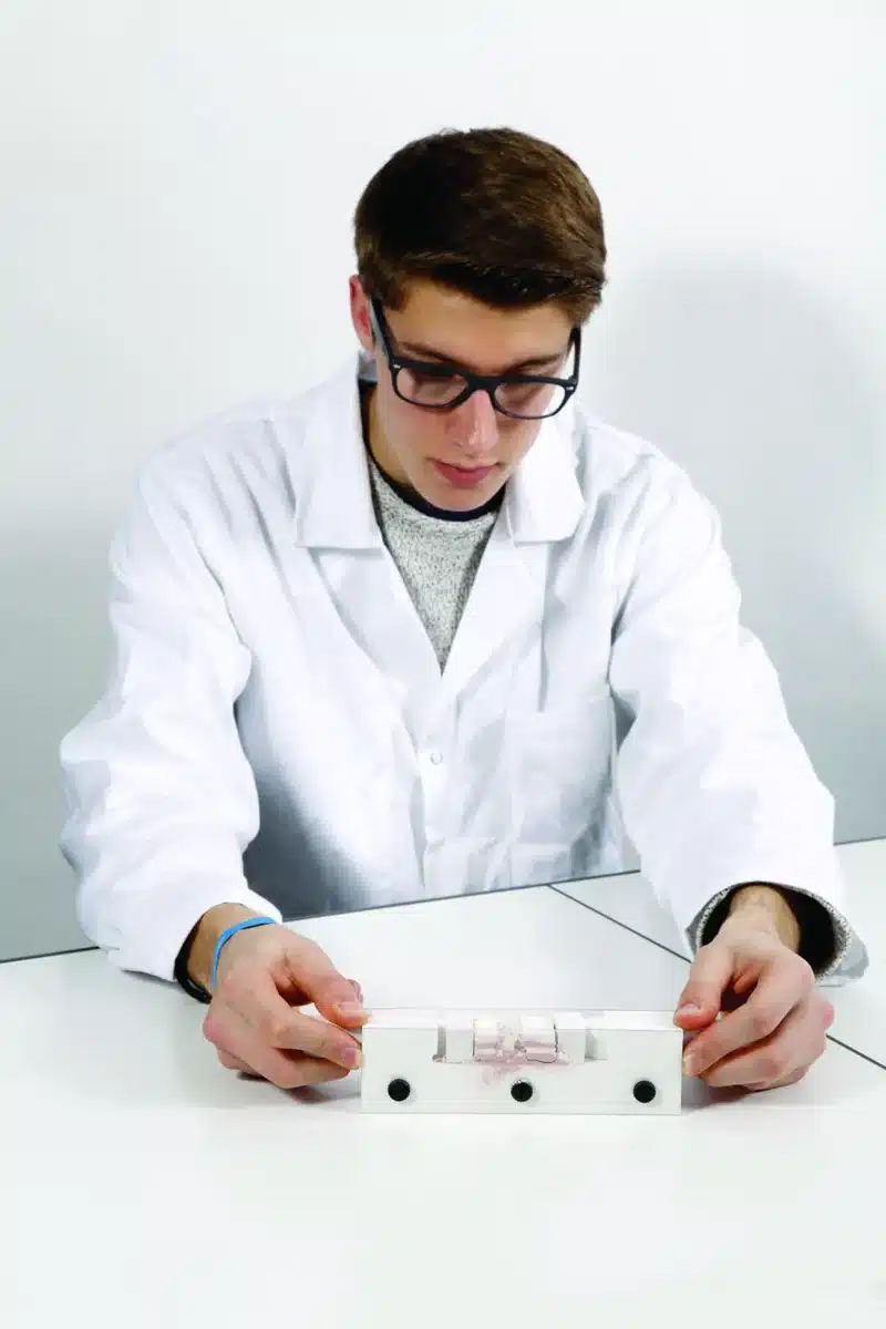 Simuleringsmaterialerne (pulvere) placeres i håndteringskammeret og vil efterligne udspiling, når kæberne spredes, eller kompressioner, når kæberne bringes sammen.