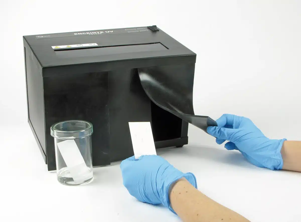 UV-bestrålingsboks. Fleksibel åbning foran for at give mulighed for introduktion af TLC-plader eller petriskåle.