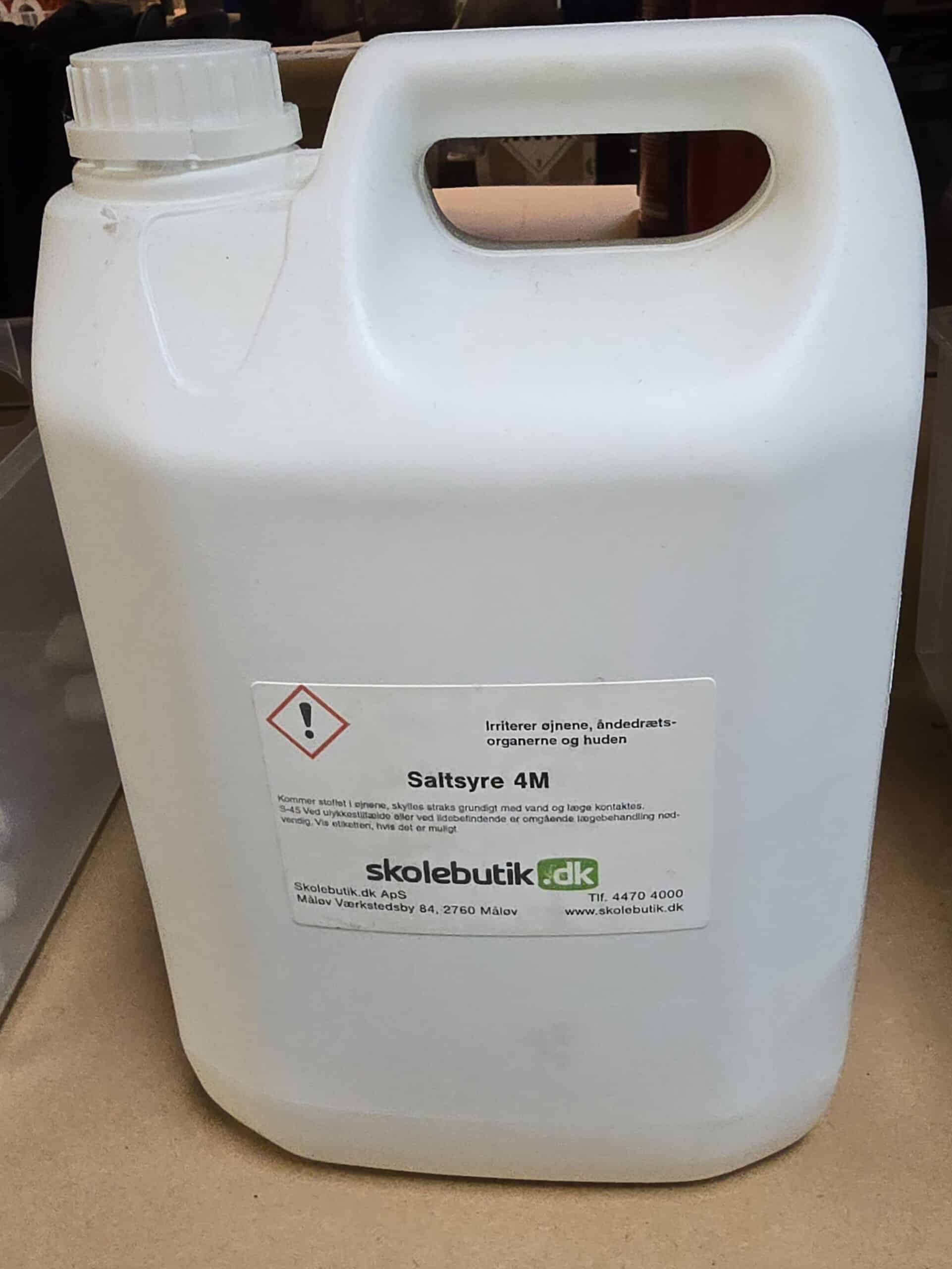 Fortyndet saltsyre 4M til kemiforsøg i undervisnings-sammenhæng. Denne vare leveres i UN godkendt plastdunk.