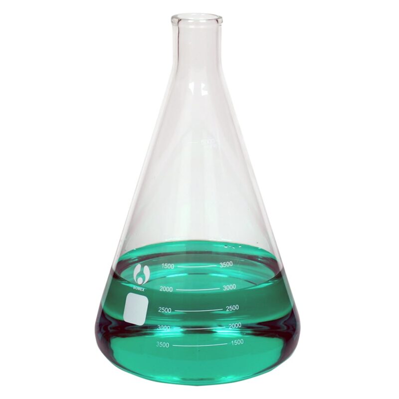 Stor konisk kolbe på 5000 ml i varmebestandigt borosilicatglas.