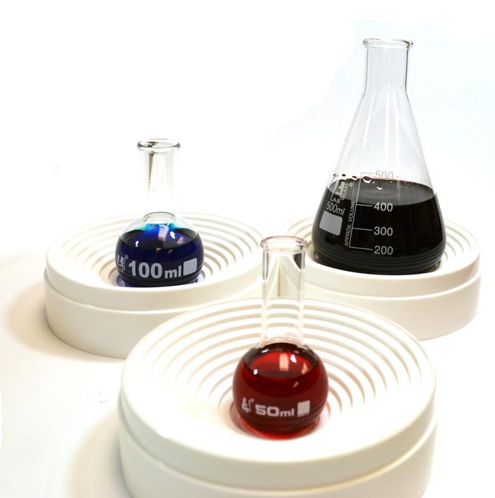 The bench top flask holder is made of sturdy plastic and has multi-leveled flask placement decks ranging from a diameter of 1 inch to a diameter of 6.25 inches. This multi-level design allows for use with flasks of various shapes and sizes. The top diameter is 6-1/4 inches, bottom diameter is 6-1/2 inches and the height is 2″.