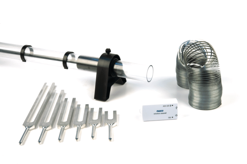 Pakken Physics Lab Station: Waves and Sound bundle er en laboratorieklar løsning til at udføre en række eksperimenter inden for bølger og lyd. Den indeholder en 2-i-1 trådløs lydsensor, et komplet teknisk sæt med stemmegaffel, en resonansluftsøjle af høj kvalitet og en slinky med dobbelt længde.