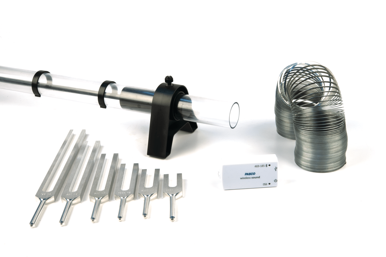 Denne pakke indeholder en trådløs lydsensor, en resonansluftsøjle og tilbehør, der bruges til at udføre en række eksperimenter med bølger og lyd.