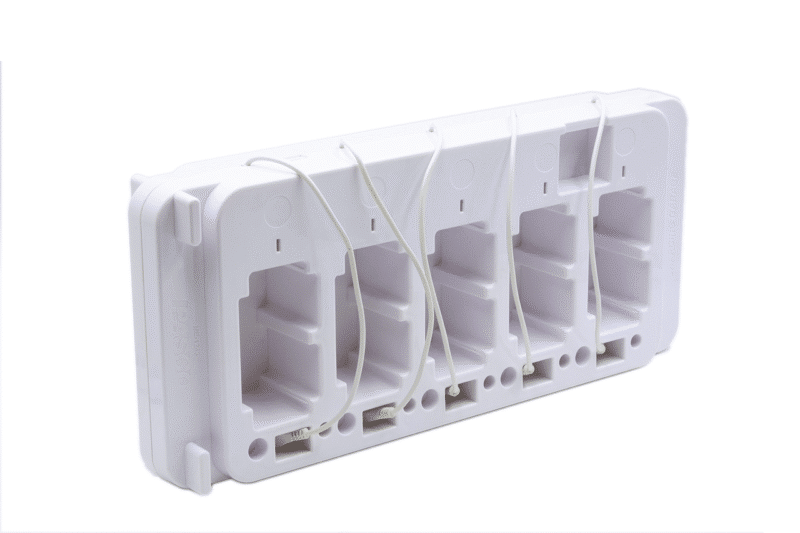 Oplad op til fem Smart Carts på én gang. Giver mulighed for opbevaring af vogne og tilbehørskofangere. Inkluderer strømadapter.