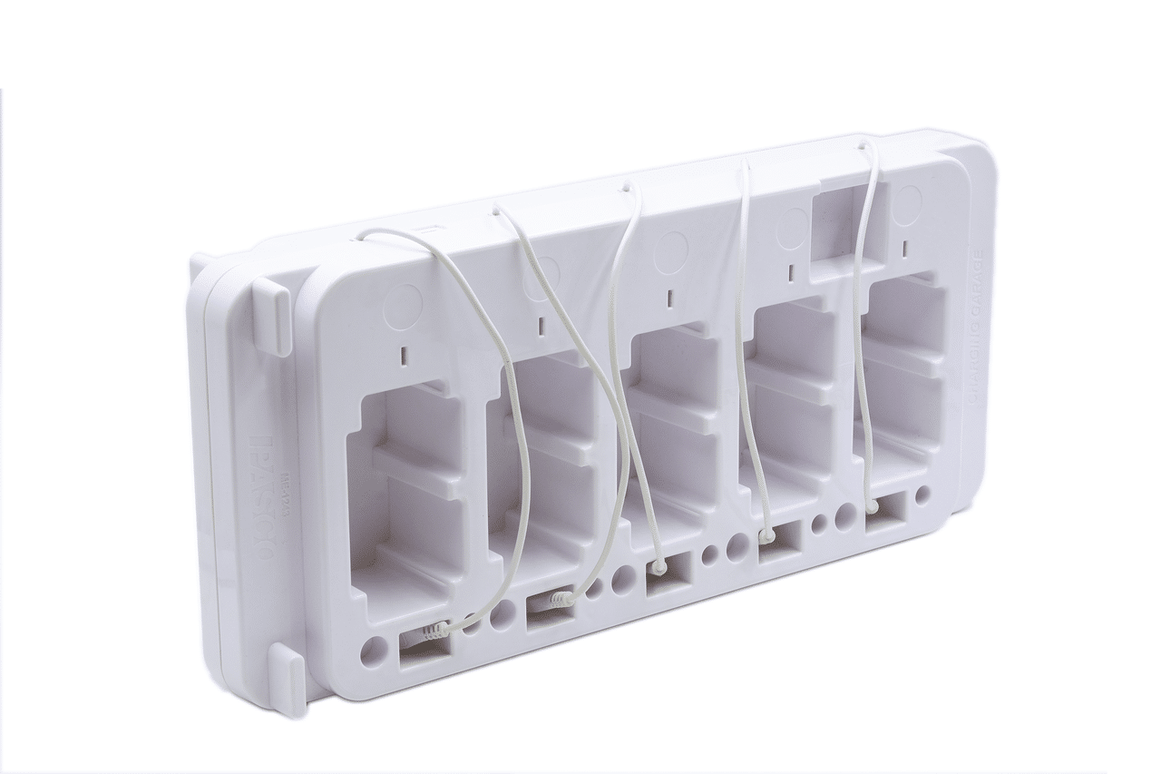 Praktisk opbevaring og opladning af op til 5 PASCO Smart Carts.