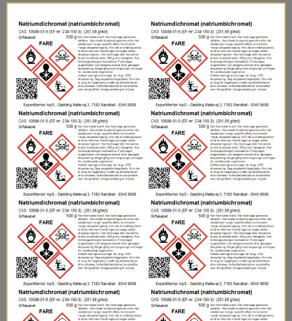 Kemikaliebestandige etiketter beregnet til udskrivning fra Experimentors etiketprogram.